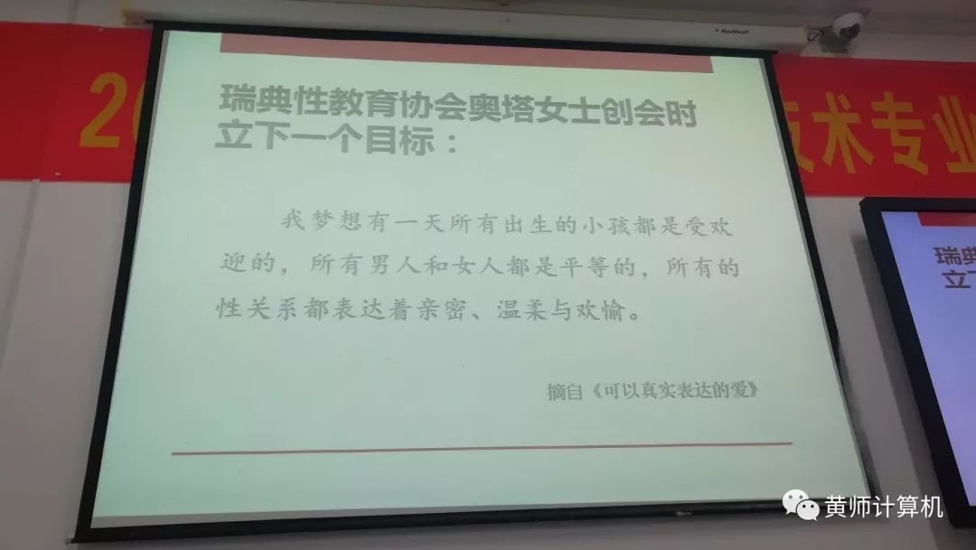 首先,王老师通过一些案例说明女生掌握一定性知识的必要性。不少女生都在两性关系中受到了不同程度的伤害,有的甚至无法生育。随后,王老师用图片、视频和问答的形式为在场女生具体讲解女性的生理结构,艾滋病的传播形式,人流的具体操作及其对子宫的危害。同时也特别强调卵子对女性的重要性,告诫全体女生千万不要捐卵。在问答环节,王老师还暖心的给大家分享大家缓解痛经的方法:忌生冷,辛辣,多喝热水和红糖水。最后老师借用《可以真实表达的爱》中的:“我梦想有一天所有出生的小孩都是受欢迎的,所有的男人和女人都是平等的,所有的性关系都表达着亲密,温柔和欢愉。”来表达自己对所有女生的美好祝愿。