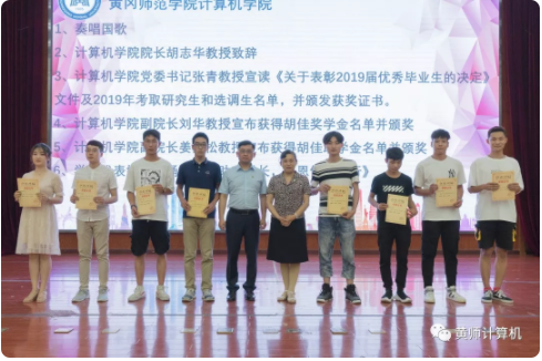 最后由学生党员代表朗诵《写在离别的渡口》和全体师生奏唱黄冈师范学院校歌,以此来祝贺和告诫黄师计算机毕业学子们,毕业后应秉承黄师校训,积极进取,为梦努力。