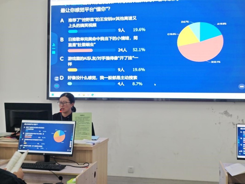 课上,杨老师以“您与AI的日常”互动投票开启沉浸式教学,2025级新生通过手机端实时上传数据,点燃课堂氛围。随后,杨老师现场演示AI生成的俄罗斯方块小游戏,对比“消费内容”与“生产内容”的差异,引出“学会AIGC=掌控内容”的教学理念。